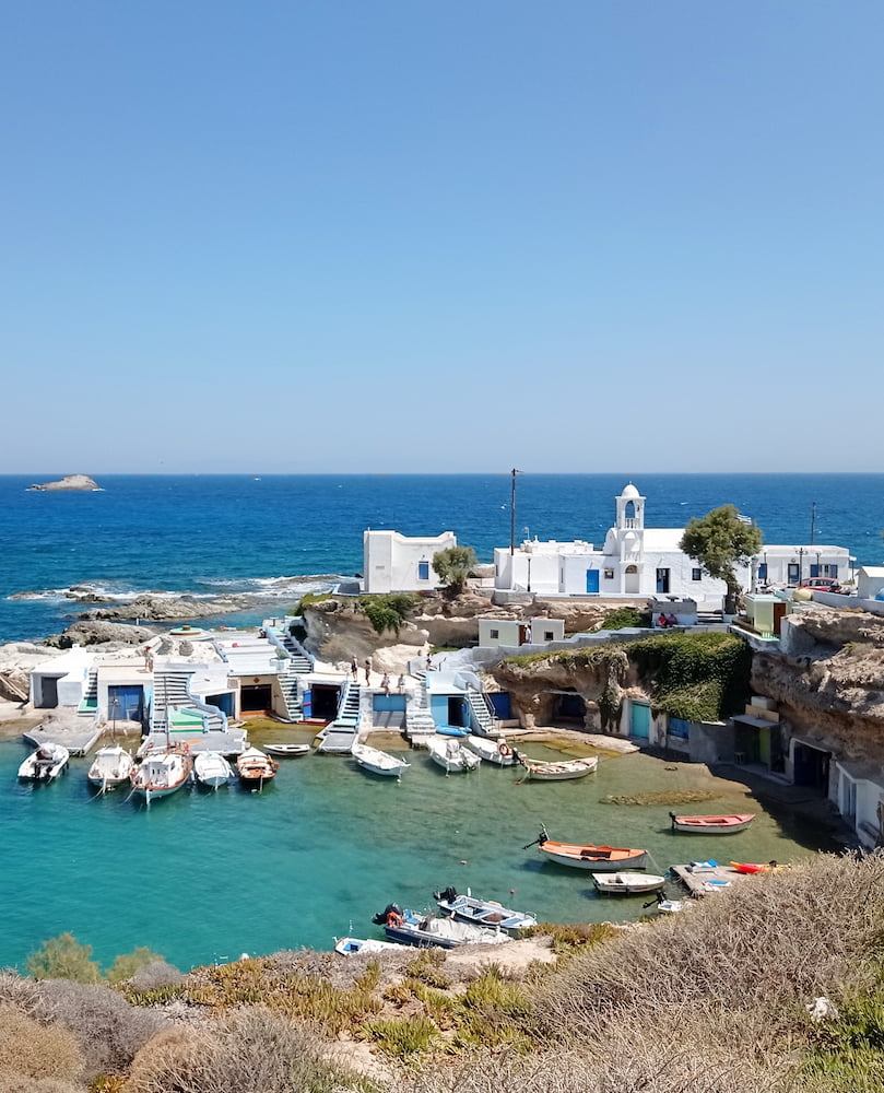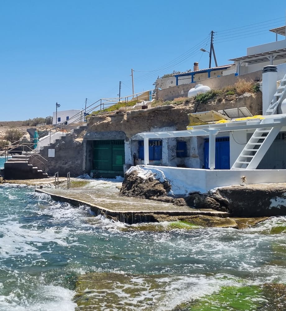 🐟 Malerisk fiskerlandsby: Klima er en lille fiskerlandsby, der ligger på Milos’ nordvestlige kyst. Denne unikke bosættelse er berømt for sine ikoniske syrmata, traditionelle farverige fiskerhuse bygget lige i vandkanten med bådgarager i stueetagen og boliger ovenpå.